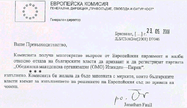 Комисията получи многократно въпроси от Европейския парламент и жалби относно отказа на българските власти да признаят и да регистрират партията Обединена македонска организация (ОМО) “Илинден”-ПИРИН.